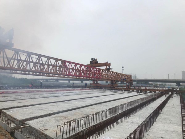 該橋橋梁斷面采用兩幅橋形式,橋梁全寬50.6米,全長(zhǎng)184.2米。針對(duì)橋梁施工范圍內(nèi)涉及地鐵4號(hào)線盾構(gòu)頂進(jìn)和賈魯河綜合治理等多部門多作業(yè)施工,我公司邀請(qǐng)了省內(nèi)知名專家進(jìn)行專項(xiàng)方案評(píng)審把關(guān)。在建設(shè)過程中,精心組織,統(tǒng)籌協(xié)調(diào),克服了現(xiàn)場(chǎng)條件復(fù)雜、汛期施工難度大等不利因素的影響,抓質(zhì)量,促進(jìn)度,保安全,順利地實(shí)現(xiàn)了橋梁合龍這一關(guān)鍵節(jié)點(diǎn)。